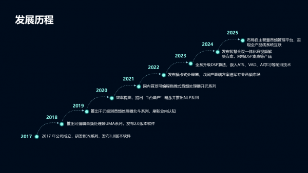 公司成立,自主研发 BEN 系列数字音频处理器,发布软件 1.0 版本,打破国外技术垄断。