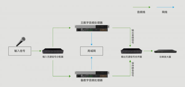 1.信号分配:将输入音源通过信号分配器一分为二,分别送入主备处理器,确保信号独立且一致。