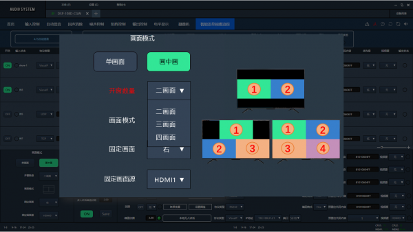 在实际会议中,内容展示画面通常需要保持稳定,而发言人画面则根据会议进程进行切换。针对这一常见需求,新版本增加了视频开窗(画中画)功能,支持多种画面组合方式。