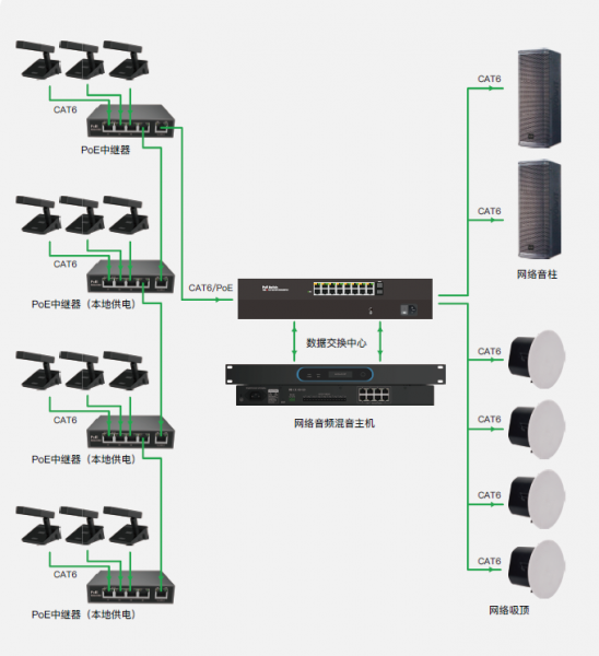 “智慧”音频管理系统是—个纯数字处理和传输的高集成会议平台, 系统由会议单元NMC101D/NMC 102D、 PoE中继器NMC4、 音频交换中心NMC16和会议主机NMC100D构成。该系统旨在提供节省线材、安装简便、 调试简易、应用高效的音频理鲜决方案。